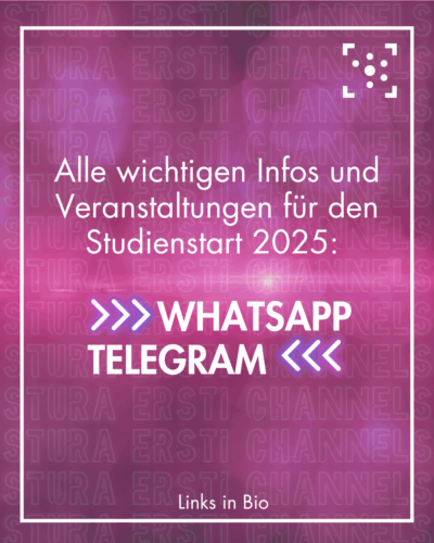 Wir sammeln alle wichtigen Infos und Veranstaltungen für euch in unseren Ersti Channels auf Telegram und Whatsapp.